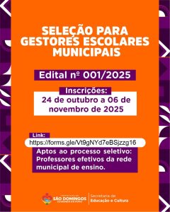 INSCRIÇÕES ABERTAS PARA O GARANTIA-SAFRA 2025/2026 29 de outubro de 2025 Leia mais » SÃO DOMINGOS CELEBRA O SUCESSO DA EXPO 2025 — FEIRA DA AGRICULTURA FAMILIAR E EXPOSIÇÃO AGROPECUÁRIA 29 de outubro de 2025 Leia mais » PREFEITURA DE SÃO DOMINGOS ORIENTA MORADORES A ATUALIZAREM O CADASTRO DE IMÓVEIS 29 de outubro de 2025 Leia mais » SELEÇÃO PARA GESTORES ESCOLARES MUNICIPAIS 29 de outubro de 2025 Leia mais » « Anterior Proximo » Diário Oficial Portal da Transparência Portal do Contribuinte Portal do Servidor Nota Fiscal Eletrônica Ouvidoria Municipal