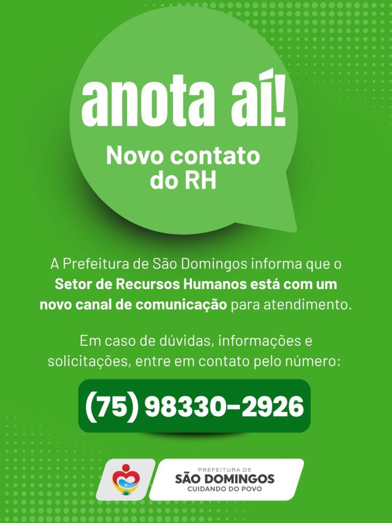 O RH da Prefeitura de São Domingos agora está com um novo número para facilitar ainda mais o atendimento. Se precisar de informações, tirar dúvidas ou fazer alguma solicitação, é só entrar em contato.