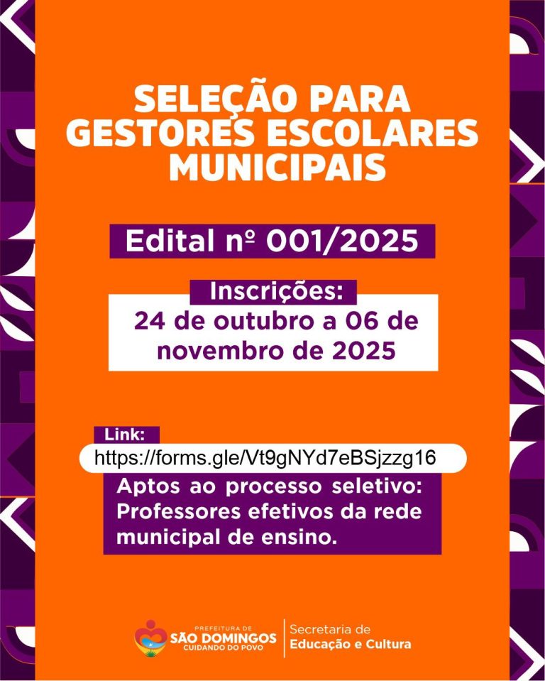 A Prefeitura de São Domingos, por meio da Secretaria Municipal de Educação e Cultura, torna pública a Seleção para Gestores Escolares Municipais, conforme o Edital nº 001/2025.